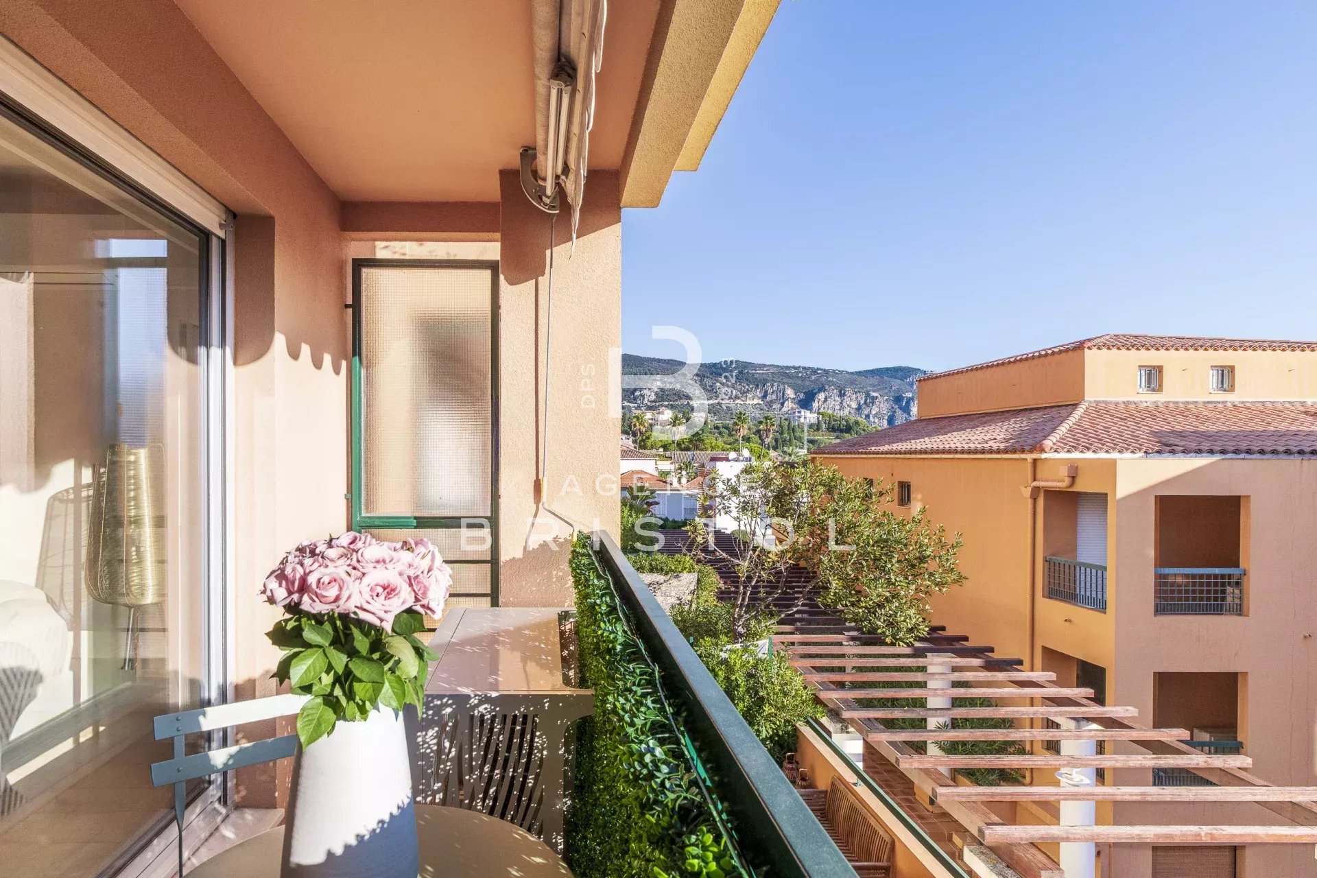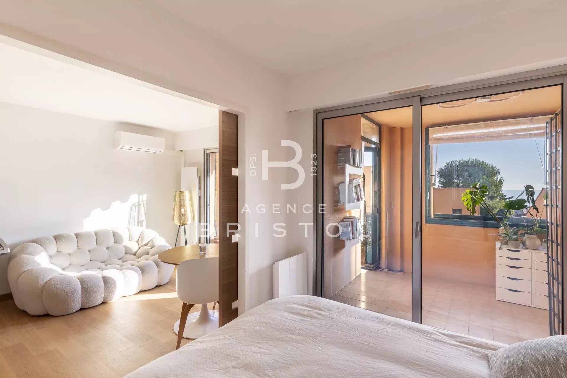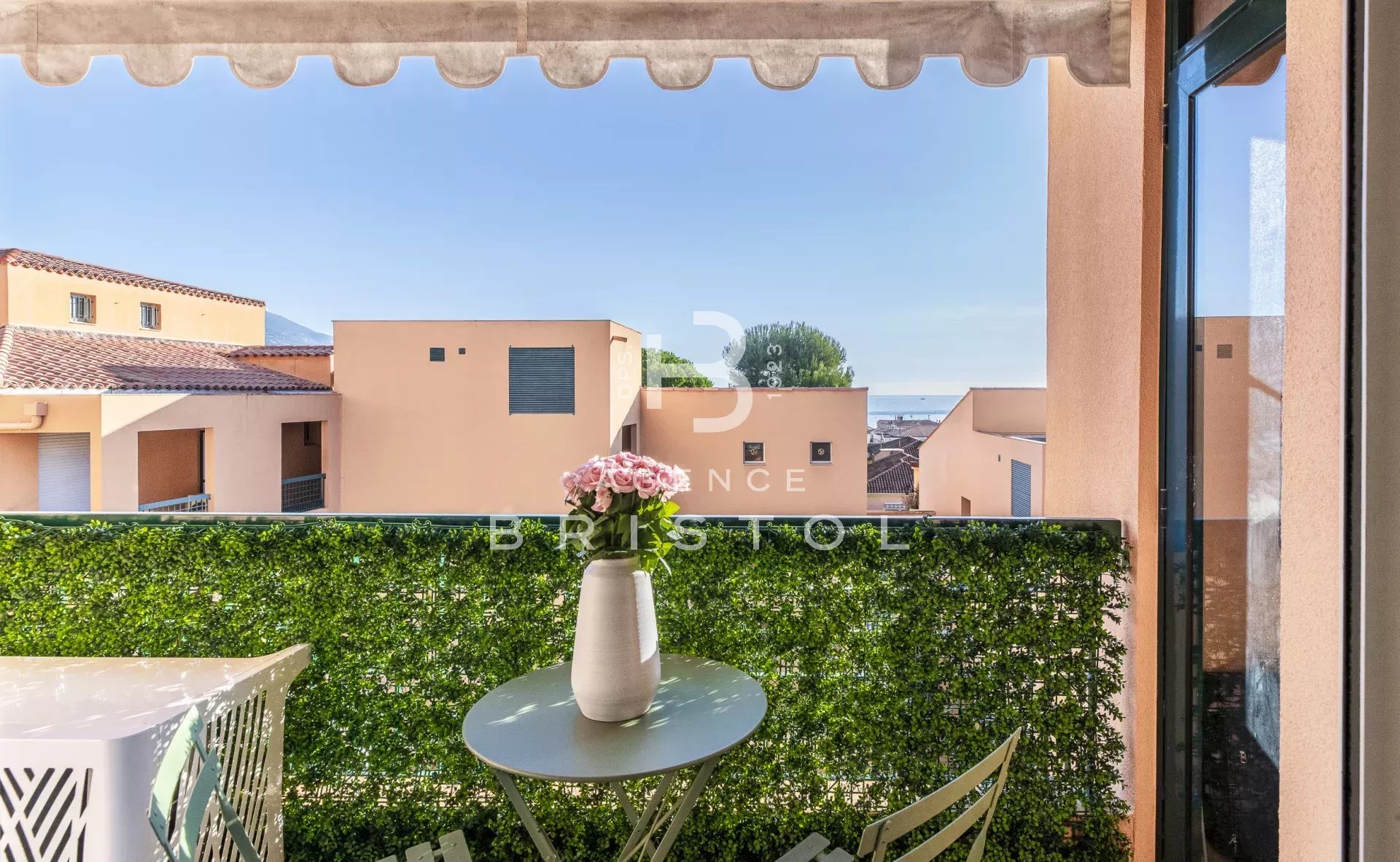 In excellent condition throughout, it features a bright living area opening onto a covered terrace / loggia with a glimpse of the sea, a fully fitted kitchen, a bedroom with built-in storage, and a bathroom with WC.
