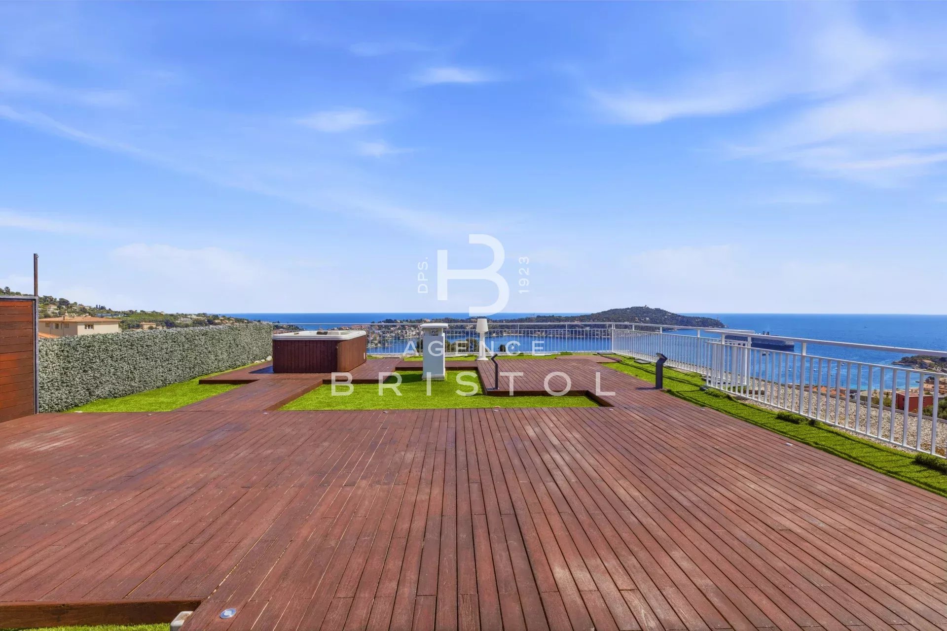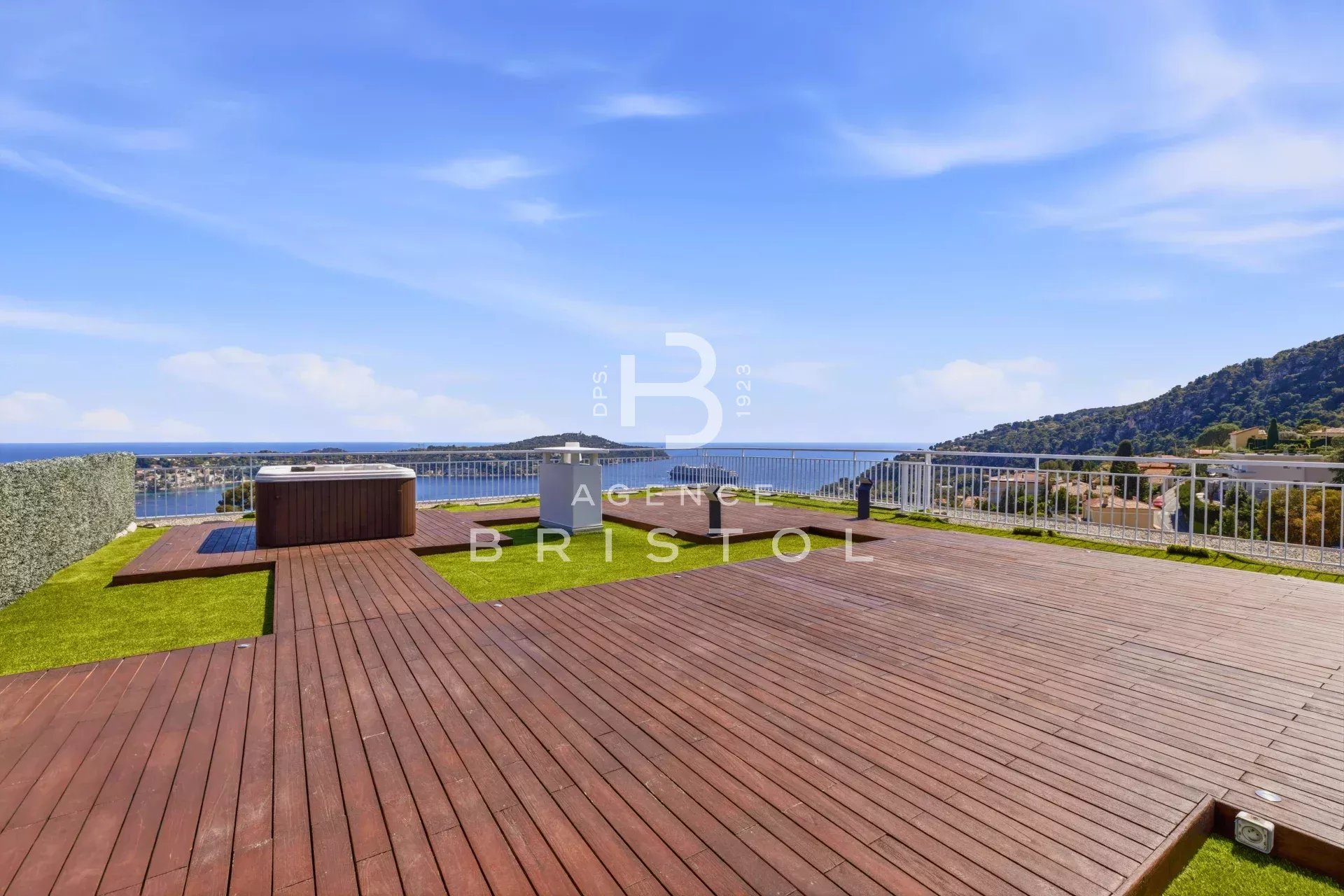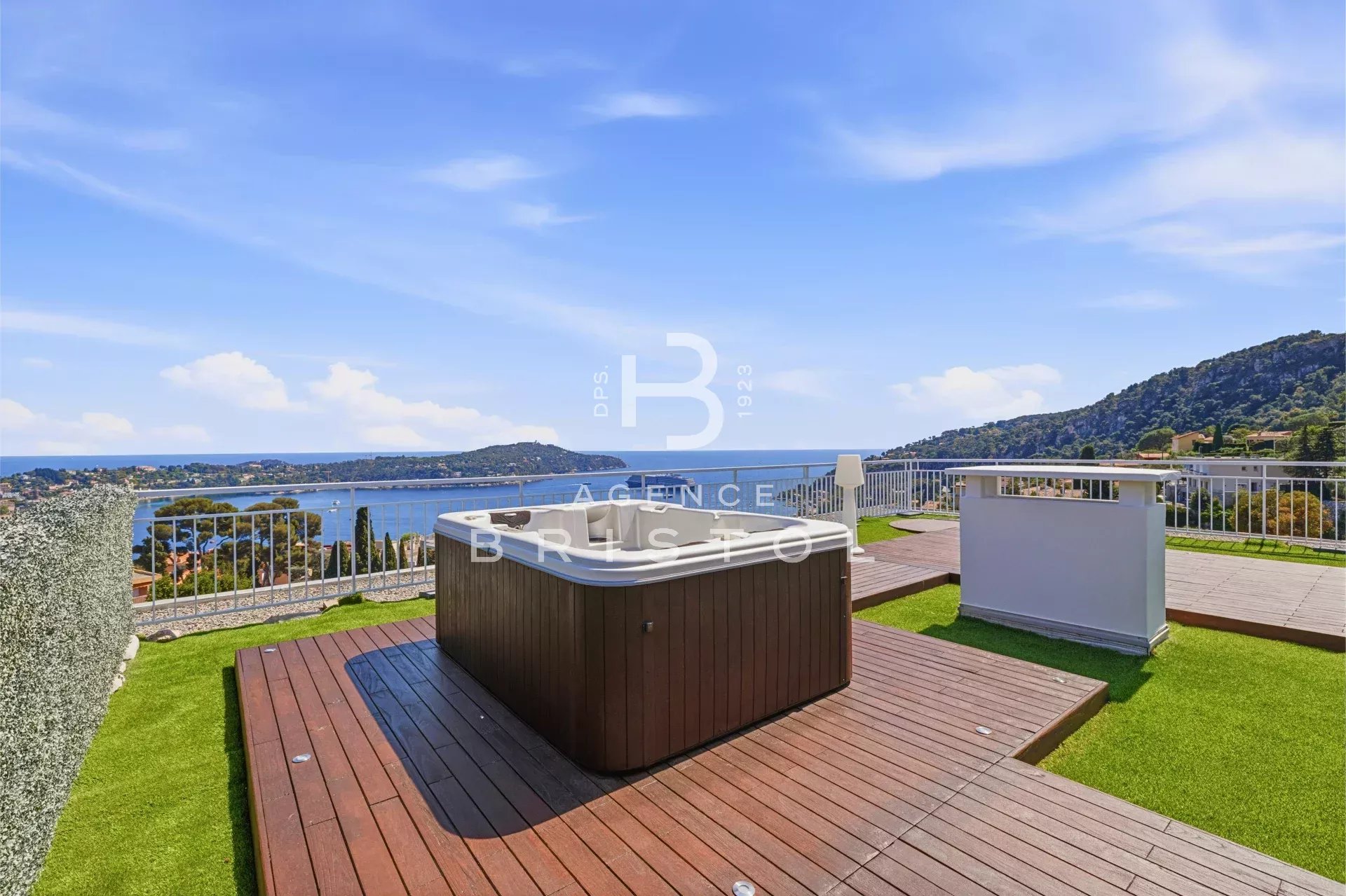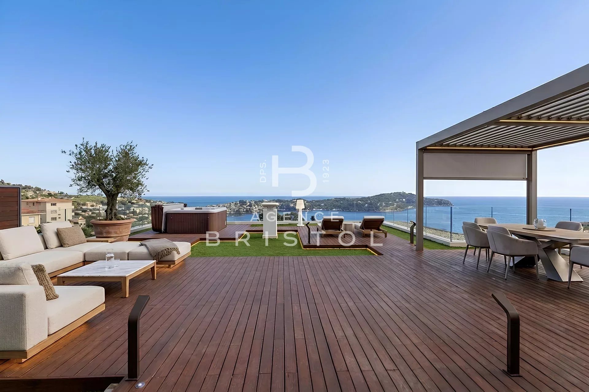 À quelques pas du centre et des plages, ce dernier étage propose un cadre de vie particulièrement privilégié, dominé par un toit-terrasse privatif de 150 m² offrant une vue panoramique spectaculaire sur la rade de Villefranche et la presqu’île de Saint-Jean-Cap-Ferrat.